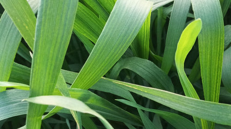 Dense soft grass with deep green color illuminated by soft lighting in a top view perspective