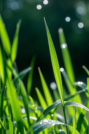 This close-up image showcases vibrant green grass adorned with glistening dew drops. Captured in soft morning light, it reflects nature's delicate beauty and freshness.
