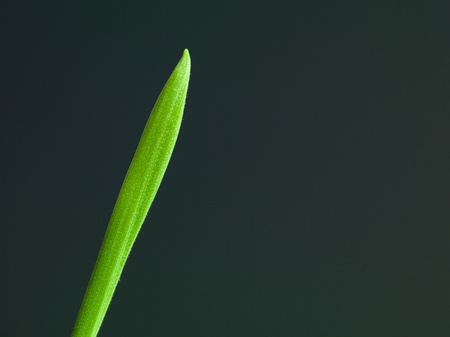 Close up of a green blade of grass on a dark background