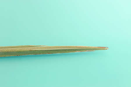 Close-up of a ripened rice ear with thin green leaves, against a blurred blue background, creating a natural yet minimalistic effect