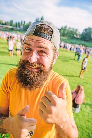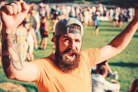 Fan zone. Entertainment concept. Visit summer festival. Summer fest. Hipster in cap happy celebrate event fest or festival. Man bearded hipster in front of crowd. Open air concert. Music festival