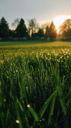 Close-up view of vibrant green grass covered in glistening dewdrops. The early morning sun casts a warm golden glow, creating a serene and refreshing natural landscape perfect for relaxation and tranquility.