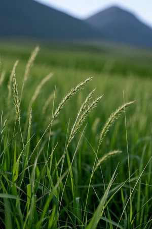 Green weeds in the fields and distant mountain landscapes