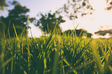 green grass with blurry shades of green background in evening