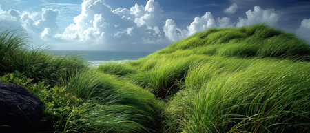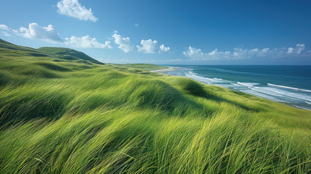 Lush green grass field meets the ocean with waves. Vast expanse of grassy dunes on the coast, bright sunlight and fluffy clouds in the sky. Coastal scenery.