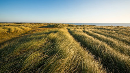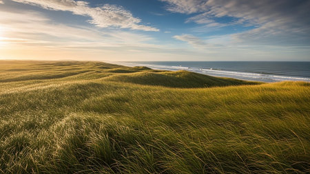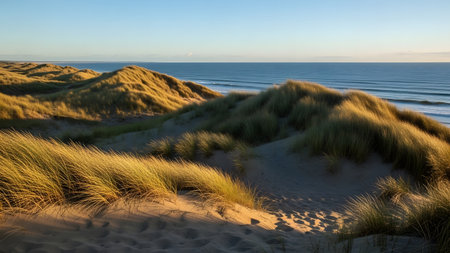 Golden hour sunlight illuminates rolling dune grasses leading towards the blue ocean horizon under a clear sky.