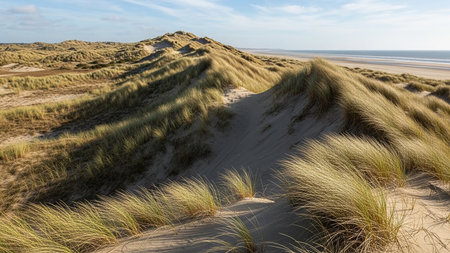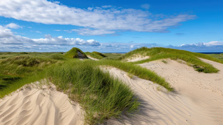 Dune landscape set against the Danish coast during summer. The photo captures the essence of the season with lyme grass sprouting up amidst the rolling sand dunes. The natural beauty and serenity of the location are sure to inspire and captivate viewers. AI generative illustration