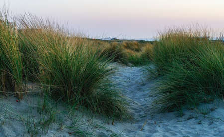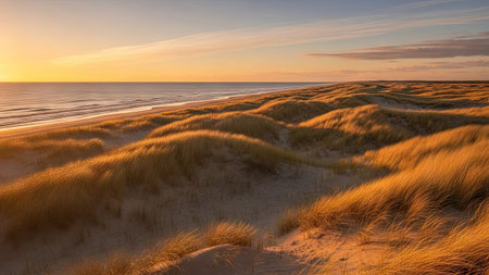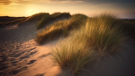 Beach grass growing on a sand dune, receiving warm golden light from a distant sunset over a calm ocean, evoking feelings of peace, serenity, and natural beauty along the coast