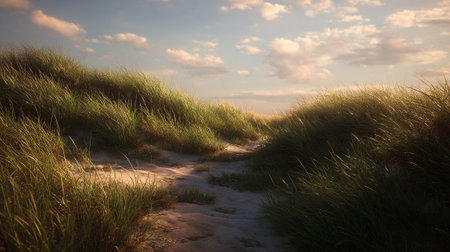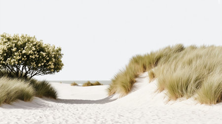 AI Generated. Tranquil Beach Scene Featuring Soft Sand Dunes with Lush Grass Growing Amidst Coastal Vistas Evoking Peaceful Serenity and Natural Beauty