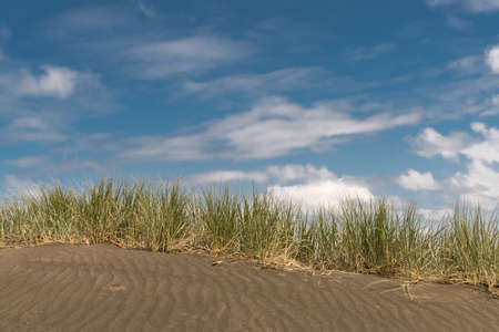 Auckland, New Zealand - March 2, 2017: Dark sand dune with horizontal line of beachgrass, marram, under blue sky with white clouds at Karakare Beach.