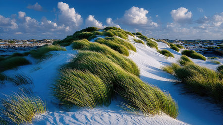 Experience the tranquil beauty of a coastal landscape featuring rolling sand dunes and vibrant green grass under a bright blue sky, ideal for nature lovers.