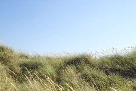 Sand dunes grasses and blue sky background