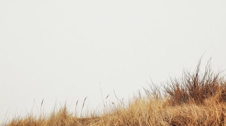 A landscape features dry grasses and sparse shrubs on a gentle slope set against a neutral-toned sky evoking a sense of calm and tranquility in nature.