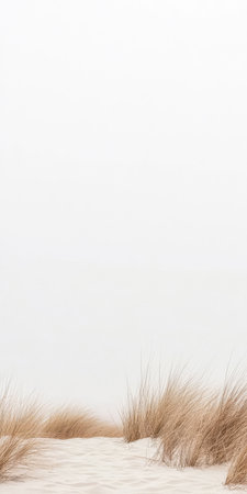 Golden grasses grow along a sandy beach creating a tranquil atmosphere. The landscape is enveloped in a soft white sky that enhances the peaceful vibe of the coastal setting.