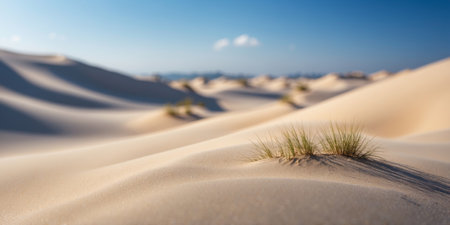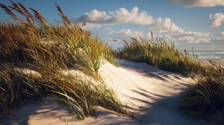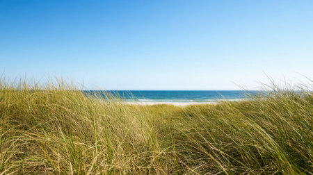 Beautiful beach dunes showcase lush grasses swaying gently in the wind under a brilliant blue sky. Perfect for capturing nature's peaceful and serene beauty.