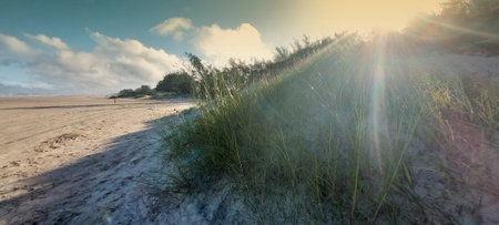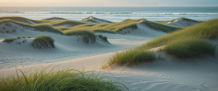 Serene Beach Scene with Soft Dunes and Sunlit Grass at Sunrise on a Tranquil Morning by the Ocean Shore