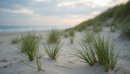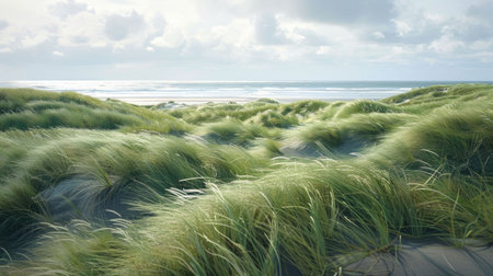 A serene beach scene captures delicate green grass swaying atop soft sand dunes, kissed by the gentle ocean breeze. The tranquil atmosphere evokes a sense of peace and connection to nature, inviting viewers to escape into this coastal paradise.