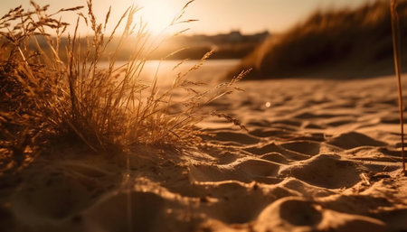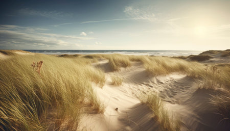 Serene ocean beach at sunset with sand dunes and grasses. That the image is generated using AI.