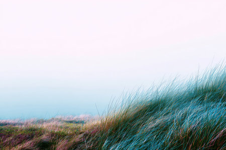 Close-up view of a hill covered with tall grass. The light is soft and misty, creating a tranquil and serene atmosphere. The grass is in various shades of green and brown, with the tops of the grass moving in the gentle breeze. A hazy light blue sky/atmosphere is visible in the distance.