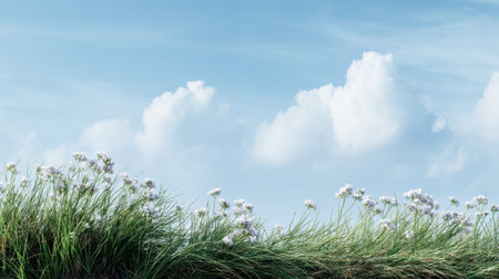 A serene image capturing a lush meadow adorned with delicate white flowers under a clear blue sky embellished with fluffy clouds, creating a tranquil nature scene.