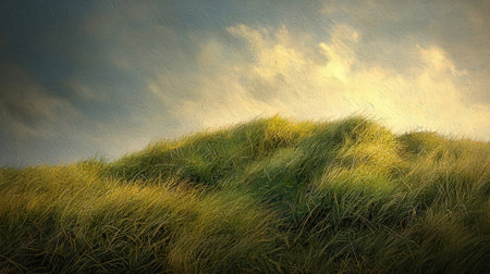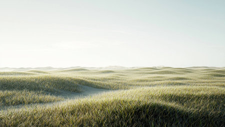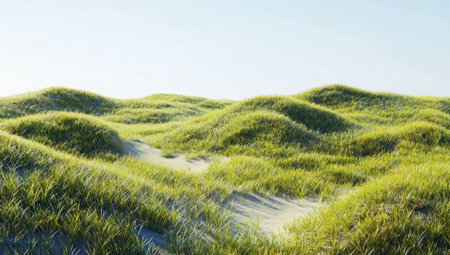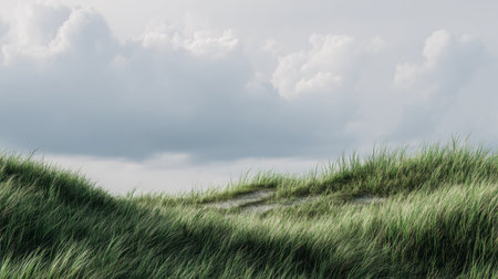 A beautiful landscape depicting lush green grass dunes rolling gently under a soft cloudy sky, inviting a sense of peace and tranquility ideal for outdoor retreats.