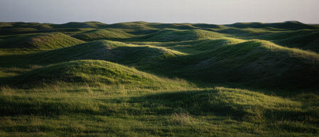 Natural showing rolling green grassy hills with perfectly spaced rounded mounds casting shadows under a clear blue sky with a distant horizon keywords: green,...