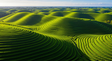 An expansive aerial view showcases vibrant green tea plantations meticulously sculpted into rolling hills. The terraced fields form patterns of concentric curves and lines, bathed in sunlight that creates a play of light and shadow. This lush, verdant landscape evokes a sense of natural beauty, tranquility, and extensive agricultural cultivation. The scene is a testament to the harmonious integration of human activity and nature.