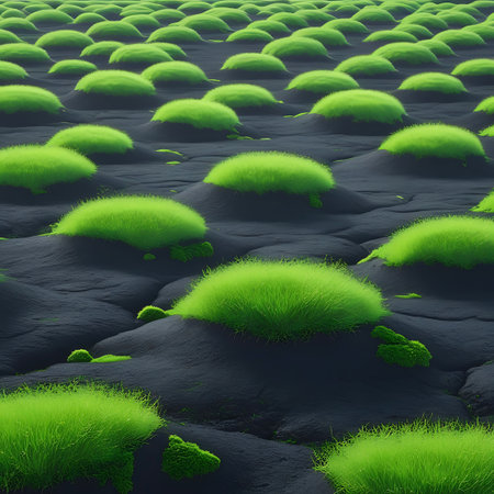 A detailed, top-down perspective of an abstract landscape characterized by numerous small, rounded mounds of bright, vibrant green grass. These formations sit atop a dark, textured, and uneven ground surface, creating a visually captivating pattern of organic shapes and contrasting colors.