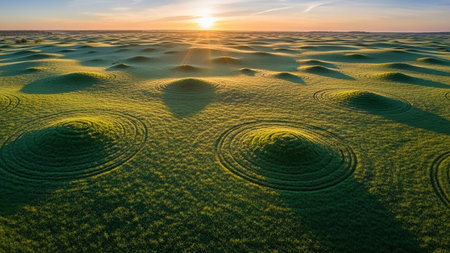 Aerial view of a green field with distinct circular mounds and patterns, illuminated by the warm golden light of sunrise.
