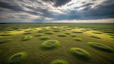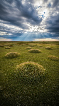 Vegetation showing expansive grassy field with circular mounds of vegetation under a dramatic sky with sunbeams breaking through dark clouds in a serene natural...