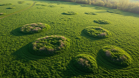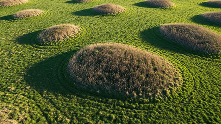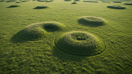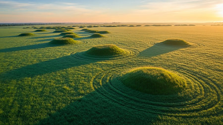 An aerial perspective of a vibrant green field featuring several distinct circular grass mounds with concentric rings, illuminated by sunlight casting shadows.
