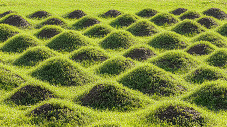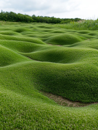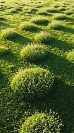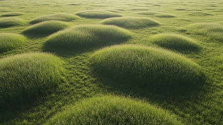 Vibrant showing unique rounded mounds of lush green grass creating a textured landscape with shadows and sunlight highlighting the natural formations keywords:...