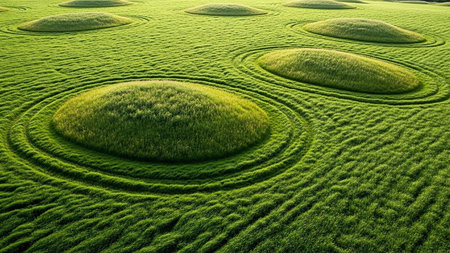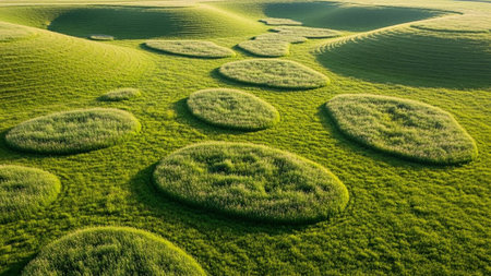 A vibrant green grass field precise circular patterns and raised oval mounds, showcasing a unique and symmetrical landscape