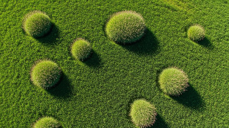 Natural showing aerial view of a lush green grassy field with perfectly round spherical bushes casting distinct shadows on the textured ground below keywords:...