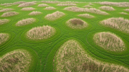 Agricultural showing circular patches of tall grass in a lush green field with concentric ring patterns from agricultural activity. resolution