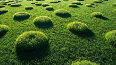 Shadows showing close-up aerial view of lush green grass forming distinct circular and oval mounds with textured surfaces and subtle shadows, highlighting natural...