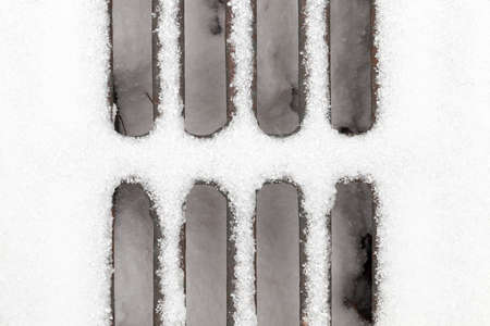 Detailed close up of drainage grille in ground. Urban city details concept.