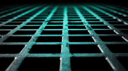 Detailed close-up of a sturdy metal grate featuring a grid of square holes, ideal for industrial settings, showcasing its sleek design and functional surface.