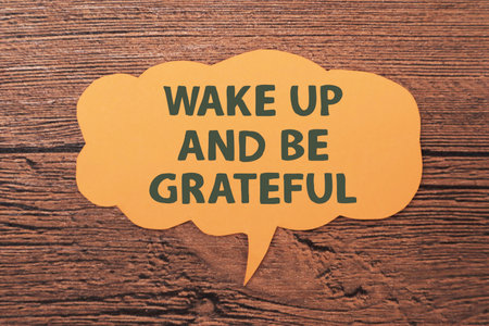Wake up and be grateful, text words typography written on paper against wooden background, life and business motivational inspirational concept