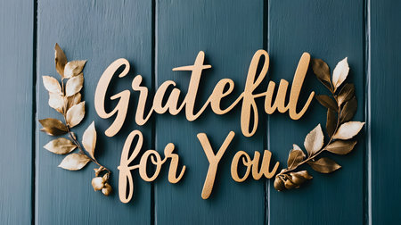 A harmonious composition with green leaves surrounding the phrase 'Grateful for You' on a dark backdrop.