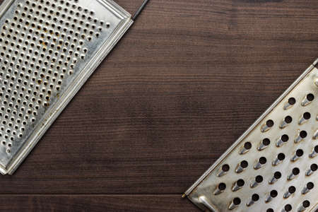 Old kitchen box graters with multiple grating surfaces and different holes, flat grater and wooden grater with special stainless steel blade on the black surface