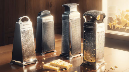 A visually striking arrangement of kitchen utensils including graters and peelers, set against a vibrant background. Ideal for culinary-themed projects and food-related content.