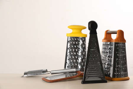 Different modern graters on white wooden table. Space for text