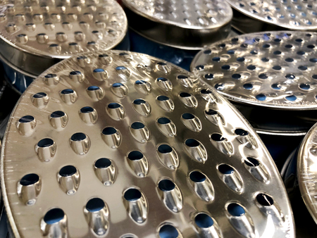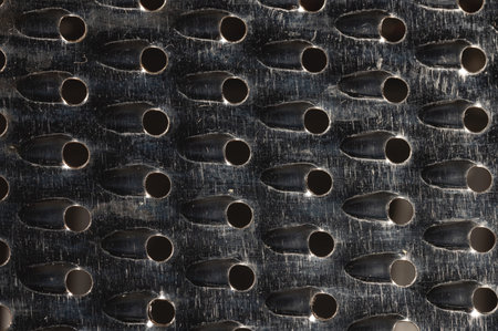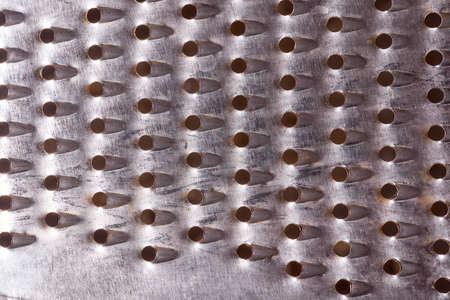 View from inside the kitchen grater. Texture of a metal surface with holes. Selective focus.