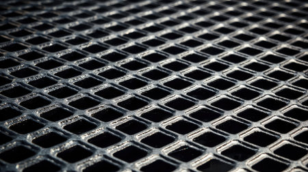 Detailed close-up of a sturdy metal grate featuring a grid of square holes, ideal for industrial settings, showcasing its sleek design and functional surface.