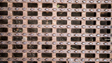 Top view of old and rusty metal covered on street drain hose. Rust metal texture background. Salt water accelerates rust. Surface of Metal in construction site near the sea.