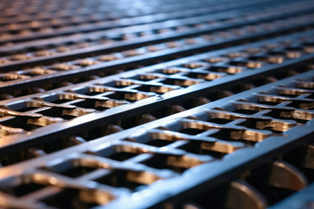 Close up of metal grating in warehouse. Selective focus. Toned.