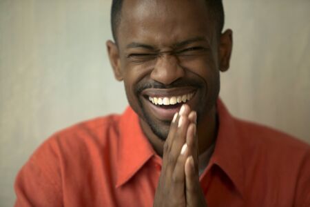 Close-up of a young man smiling in the prayer position