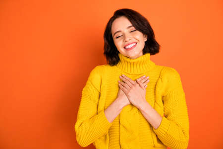 Attractive beautiful young female joining hands in praying gesture with hope, pretty cute girl asking help and support, looking at camera, wears yellow sweater, isolated on orange background