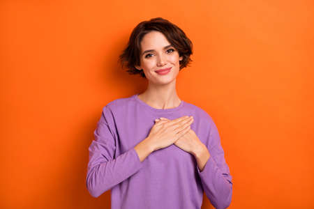 Photo of gorgeous candid person arms palms touch heart look camera isolated on orange color background